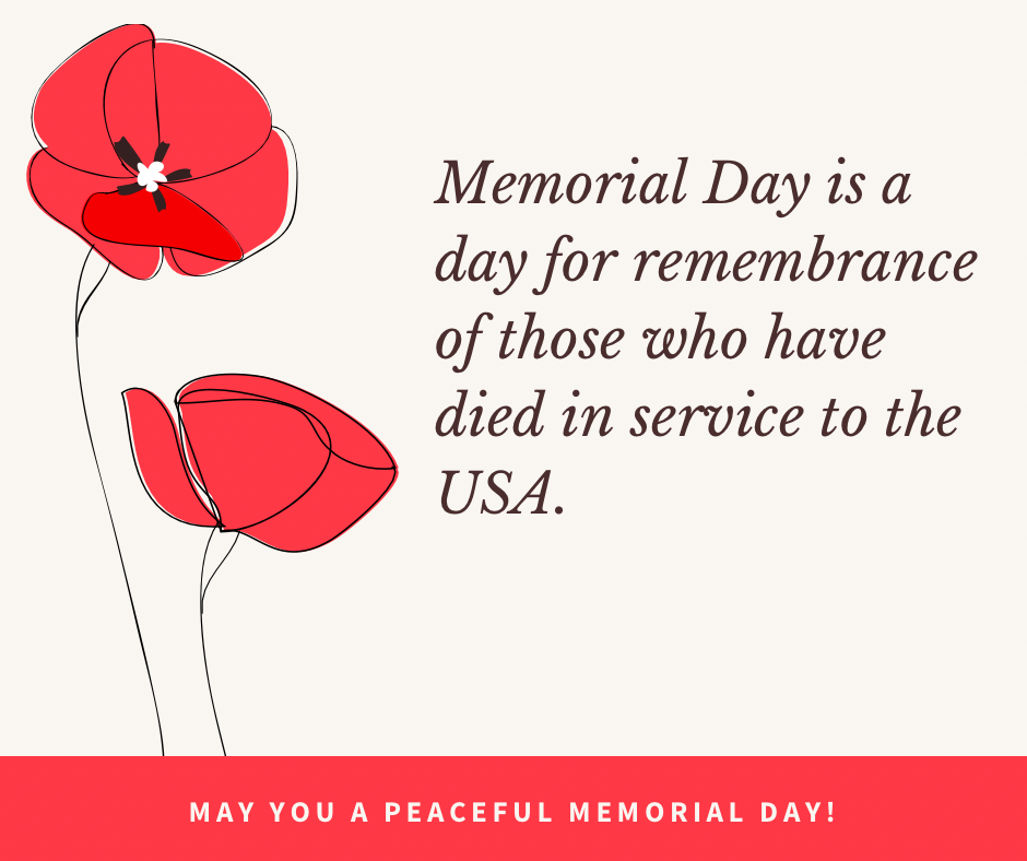 Image Description: Two poppies, which are small red flowers that symbolize Memorial Day. Caption: Memorial Day is a day for remembrance of those who have died in service to the USA. May you have a peaceful Memorial Day!